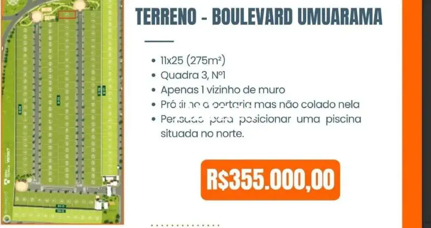 TERRENO NO CONDOMÍNIO BOULEVARD UMUARAMA COM 275M2 - 11X25 - PRÓXIMO A PORTARIA