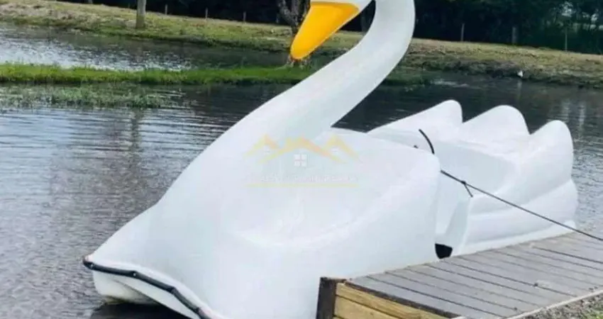 Rico em água, lagos com ilhas e pedalinhos para passeio. Vivência com animais, Piscina, pracinha, cancha de bocha, pomar, fogo de chão, salão de festas