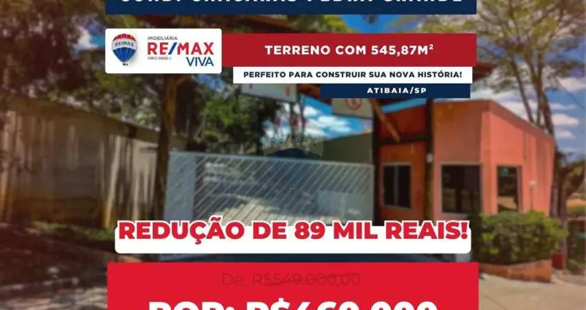 No Condomínio Chácaras Pedra Grande, em Atibaia/SP, está à venda um lote único: 545,87 m² por R$ 549.000, com levíssimo aclive, sem árvores e uma vista privilegiada para a natureza que abraça a região.