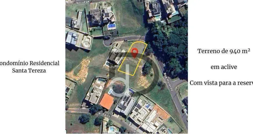 Terreno á venda com 940 m2 em acrive, Este terreno tem um potencial incrível para quem quer ter uma casa no alto, com vista. No condomínio Santa Tereza, que oferece segurança 24 horas, um belo clube, com: